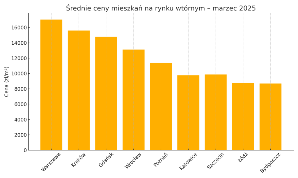W marcu 2025 roku średnia cena ofertowa mieszkań z rynku wtórnego w Polsce wyniosła 11 936 zł/m². Choć ogólny trend cen pozostaje względnie stabilny, poszczególne miasta wykazują wyraźne różnice w dynamice zmian. W największych aglomeracjach, takich jak Warszawa i Kraków, ceny nieco spadły, natomiast w miastach takich jak Katowice czy Bydgoszcz obserwujemy wyraźne wzrosty. To dowód na to, że rynek wtórny w Polsce wciąż pozostaje bardzo zróżnicowany regionalnie.